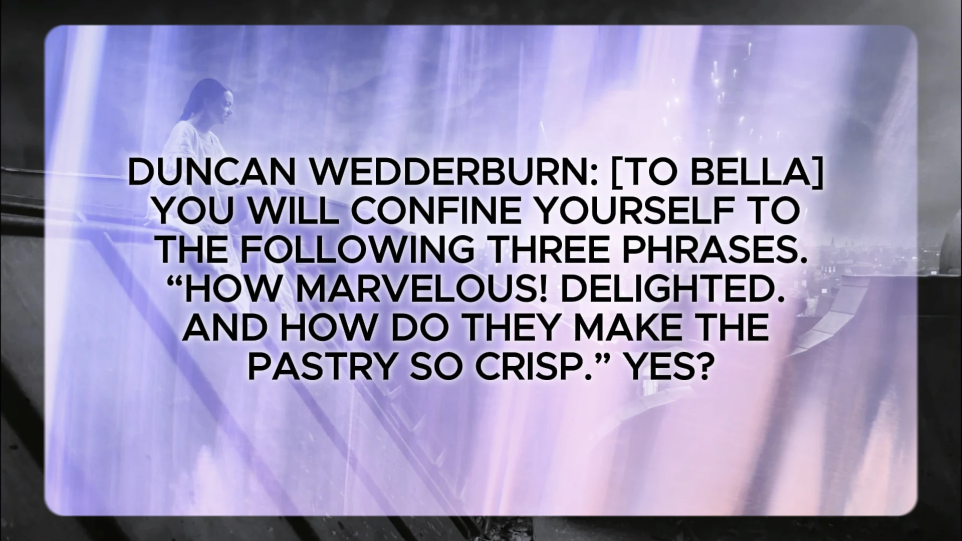 Duncan Wedderburn: [to Bella] You will confine yourself to the following three phrases. “How marvelous! Delighted. And how do they make the pastry so crisp.” Yes?